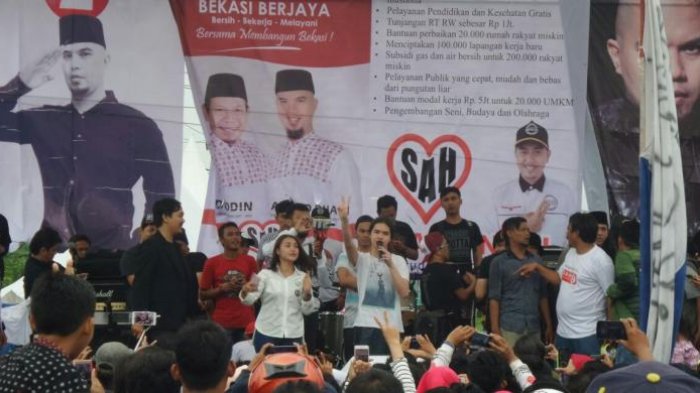 TRIBUNNEWS.COM - Ahmad Abdul Qodir Jaelani atau Dul (16) ikut berkampanye untuk ayahnya, calon wakil bupati Kabupaten Bekasi Ahmad Dhani, di Perumbahan Bumi Waringin Indah, Desa Waringin Jaya, Kabupaten Bekasi, Minggu (29/1/2017).
