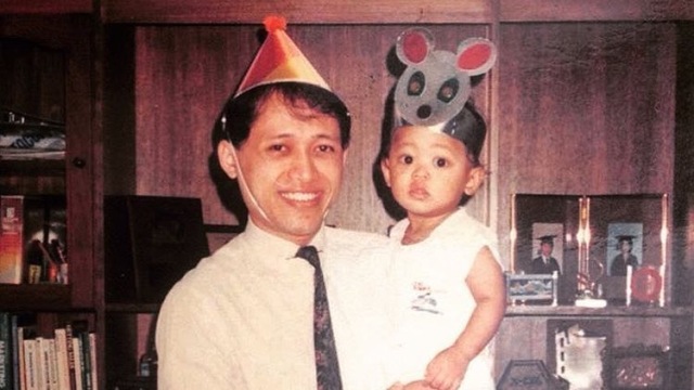 Dalam foto tersebut, tampak Mario Teguh tengah menggendong Kiswinar yang masih balita.