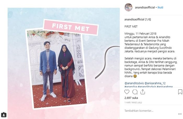 Akun instagram @anandisaofficial sempat mengunggah cerita perjalanan cinta Anisa Rahma dan suaminya. Ternyata pertemuan pertama Anisa Rahma dan Dito baru terjadi pada 11 Febuari 2018.