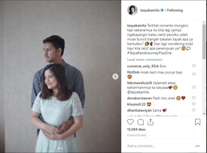 "Dan lagi wondering kira-kira bayi kita laki-laki apa perempuan ya?" tulis Tasya Kamila seperti Grid.ID kutip pada Minggu (9/12/2018).(*)