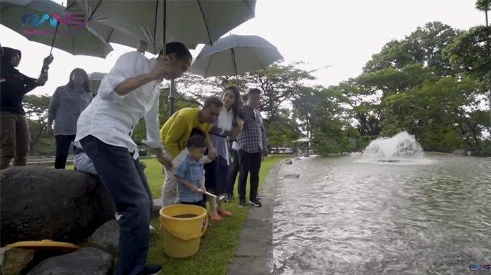Momen Jokowi payungi Raffi Ahmad tercipta tatkala Presiden mengajak Rafathar untuk memberi makan ikan di kolam.