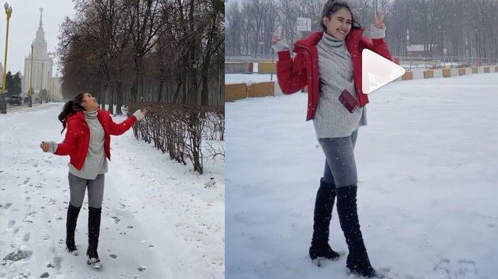 Pada video tersebut Ayu Ting Ting tampak mengumbar senyum menikmati hujan salju.