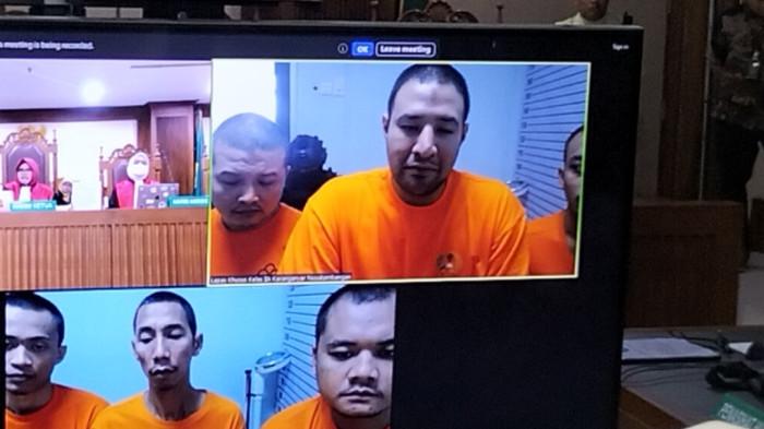 Terlihat ia bersama sejumlah terdakwa lainnya mengenakan baju oranye dengan kepala botak.