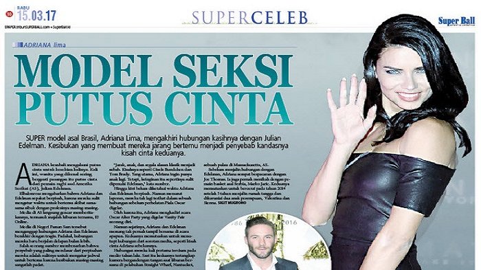 TRIBUNNEWS.COM - Super model asal Brasil, Adriana Lima, mengakhiri hubungan kasihnya dengan Julian Edelman, pemain sepak bola khas Amerika.