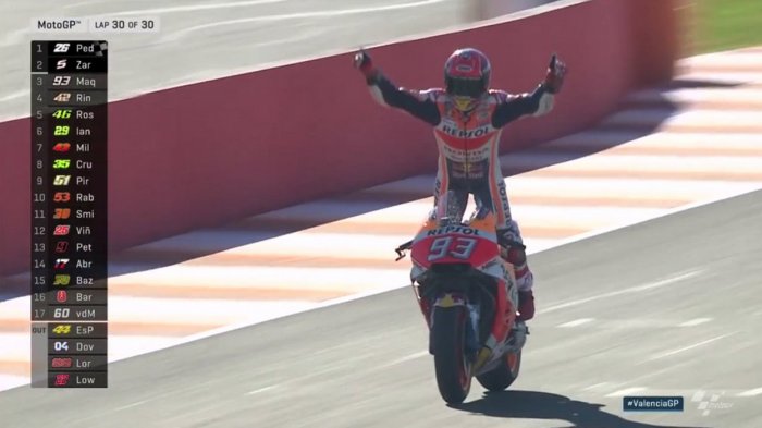 Dengan hasil tersebut, Marc Marquez dipastikan menjadi juara dunia MotoGP 2017.