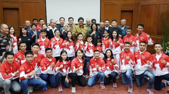 TRIBUNNEWS.COM, JAKARTA - Ketua Umum Pengurus Besar Wushu Indonesia (PB WI). Airlangga Hartarto melepas keberangkatan Tim Wushu Indonesia ke Kejuaraan Dunia Wushu Yunior di Brasilia , 9-16 Juli 2018.