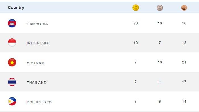 Dari informasi resmi di situs SEA Games 2023 Kamboja, saat ini Indonesia telah mengemas 10 emas, 7 perak, dan 18 perunggu.