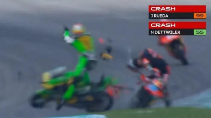 Sementara itu, Rueda dari tim Red Bull KTM Ajo melaju kencang dari arah belakang dan menabrak motor Dettwiler.