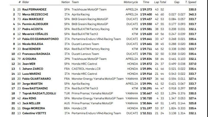 Posisi 6-10 masing-masing dihuni oleh Maverick Vinales, Fabio Di Giannantonio, Nicolo Bulega, Brad Binder, dan Francesco Bagnaia.