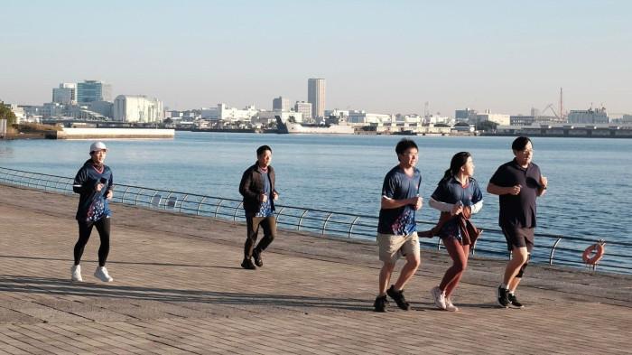 Sebanyak 120 peserta—terdiri dari dokter, peneliti, dan praktisi kesehatan jantung—berlari di rute Rinko Park South Exit Plaza, Minato Mirai, Yokohama, Prefektur Kanagawa, Jepang, sambil mengikuti aktivitas edukasi deteksi dini aritmia dan cara memeriksa denyut nadi.
