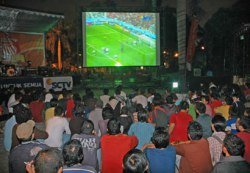 TRIBUNNEWS.COM, BANDA ACEH - Sejumlah warga Banda Aceh tumplek di Cafe Atalanta, guna menonton pertandingan klasik antara Real Madrid Vs Barcelona dalam laga Piala Super Spanyol, Senin (15/8/2011) dini hari.