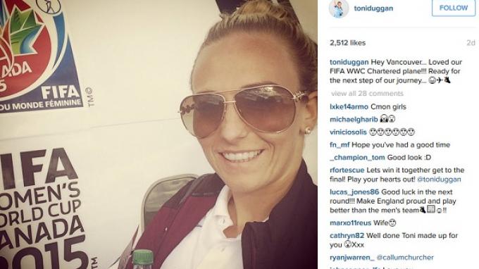 Melalui akunnya di Instagram, Duggan mengunggah fotonya dengan latar belakang poster Piala Dunia Wanita (WWC) 2015 di Kanada setibanya di Vancouver, kemarin.