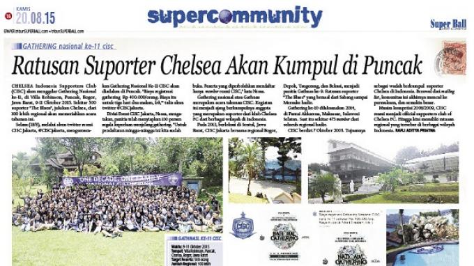 TRIBUNNEWS.COM - Chelsea Indonesia Supporters Club (CISC) akan menggelar Gathering Nasional ke-11, di Villa Robinson, Puncak, Bogor, Jawa Barat, 9-11 Oktober 2015. Sekitar 500 suporter "The Blues", julukan Chelsea, dari 100 lebih regional akan memeriahkan acara tahunan ini.