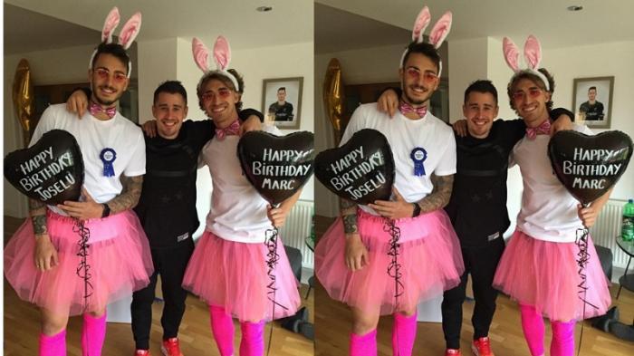 Dua pemain Stoke City, Joselu dan Marc Muniesa, tampil konyol saat merayakan hari ulang tahun.