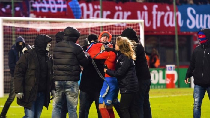 Dilansir dari Daily Mail, fans Helsingborgs yang memakai topeng merangsek ke lapangan dan menanggalkan jersey pemain 19 tahun tersebut.