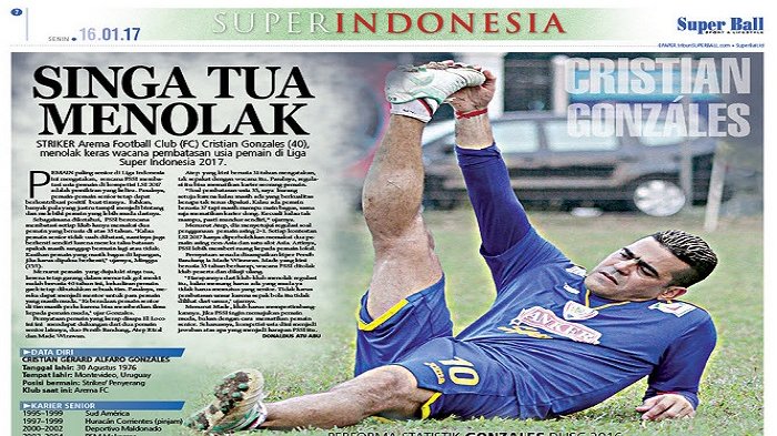 TRIBUNNEWS.COM - Striker Arema Football Club (FC) Cristian Gonzales (40), menolak keras wacana pembatasan usia pemain di Liga Super Indonesia 2017.