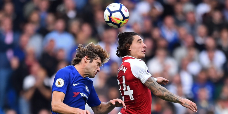 Pemain Chelsea, Marcos Alonso (kiri), berduel dengan bek Arsenal, Hector Bellerin, dalam laga Liga Inggris di Stadion Stamford Bridge, London, pada 17 September 2017. GLYN KIRK/AFP/BOLASPORT.COM