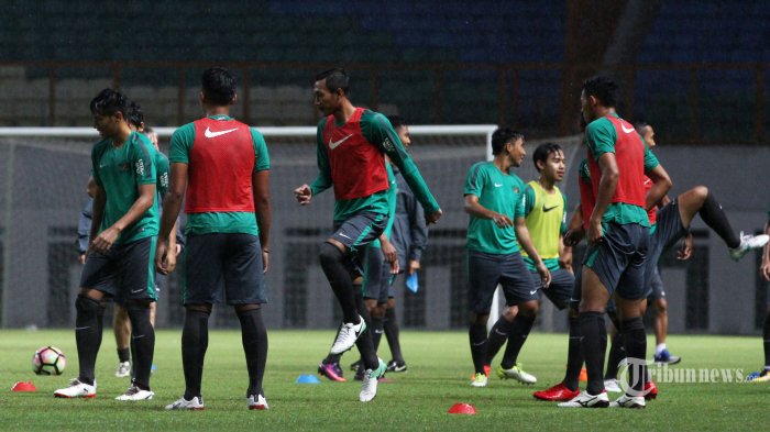 Sejumlah pemain Timnas Indonesia U-23 melakukan latihan di Stadion Wibawa Mukti, Cikarang, Jawa Barat, Selasa (14/11/2017). Latihan tersebut dilakukan guna menghadapi laga uji coba melawan Timnas Suriah U-23. TRIBUNNEWS/IRWAN RISMAWAN