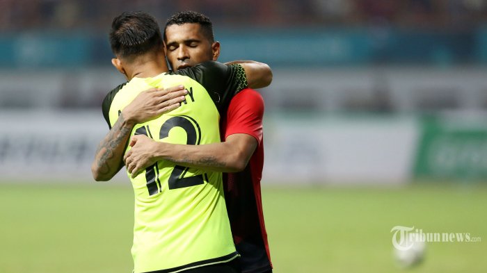 Pemain Tim Nasional Indonesia Alberto Goncalves memeluk Anditany Ardhiyasa saat melawan Uni Emirat Arab (UEA) dalam pertandingan babak 16 besar sepakbola Asian Games 2018 di Stadion Wibawa Mukti, Cikarang, Jawa Barat, Jumat 924/8/2018). Indonesia gagal melaju ke babak selanjutnya setelah dikalahkan UEA dalam adu pinalti setelah bermain imbang 2-2 pada waktu normal. TRIBUNNEWS/IRWAN RISMAWAN