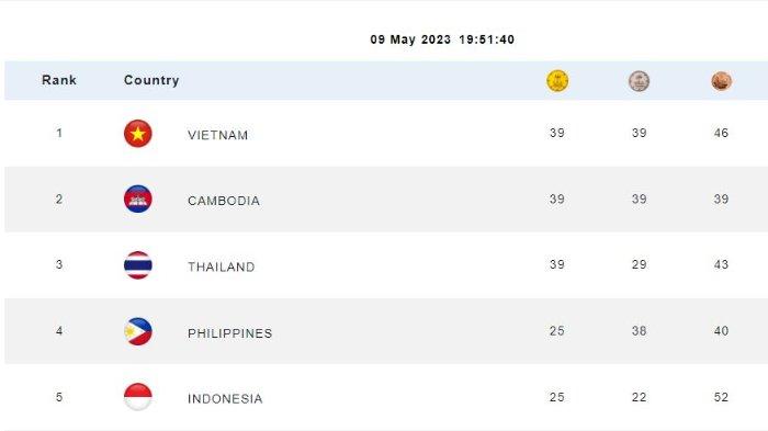 Vietnam mengambil alih puncak klasemen, setelah menyamai perolehan medali emas Kamboja selaku tuan rumah dengan 39 emas.