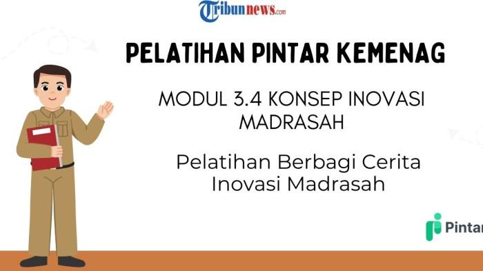 Kunci Jawaban Modul 3.4 Konsep Inovasi Madrasah, PINTAR KemenagSoal dan jawaban ini terdapat pada Modul 3.4 Konsep Inovasi Madrasah PINTAR Kemenag, tepatnya pada Pelatihan Berbagi Cerita Inovasi Madrasah.