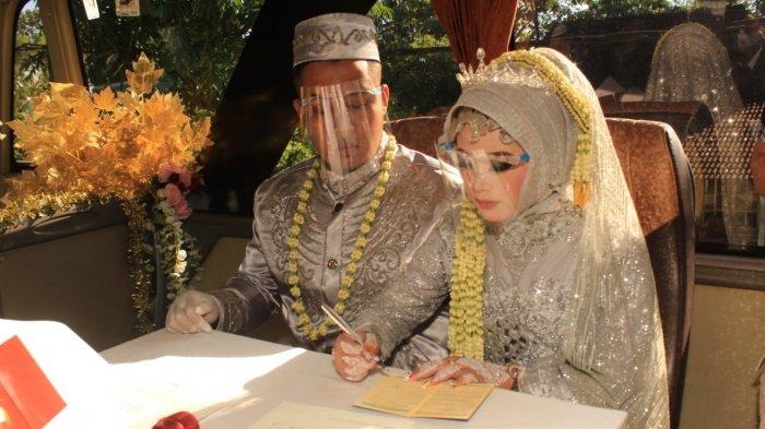 Prosesi pernikahan di dalam bus dilangsungkan oleh pasangan pengantin Titin Rachmatul Ummah (23) dan Angga Hayu Joko Siswoyo (26).