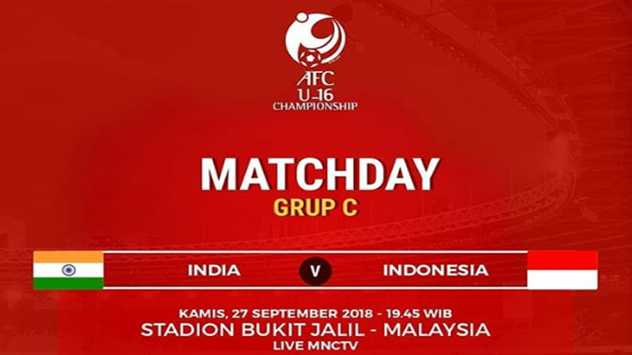 Pertandingan Timnas U-16 Vs India akan disiarkan secara langsung di MNC TV mulai pukul 19.00 WIB.