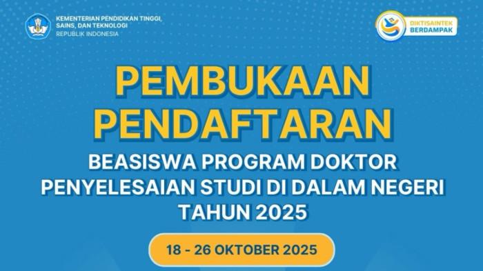 Kemdiktisaintek buka Beasiswa Program Doktor Penyelesaian Studi di Dalam Negeri 2025, pendaftaran mulai 18-26 Oktober 2025, beri dana Rp 25 juta.