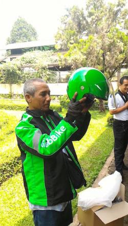 Di Jakarta, driver GrabBike langsung ganti kostum. Jaket hijau hitam yang lama diganti dengan yang baru bersamaan dengan logo Grab.