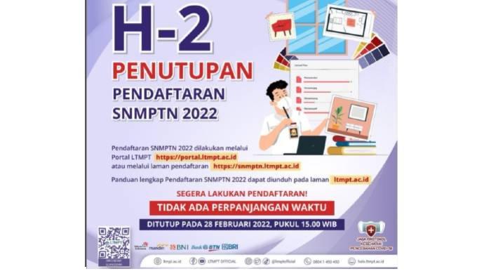 Pendaftaran SNMPTN segera ditutup 2 hari lagi, yaitu pada 28 Februari 2022 pukul 15.00 WIB, LTMPT ingatkan peserta bahwa tidak ada perpanjangan waktu.