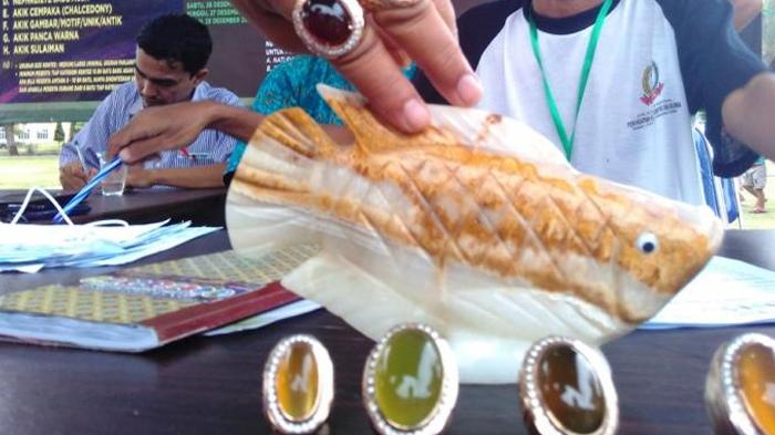 TRIBUNNEWS.COM - Sebongkah batu akik yang telah didesain mirip ikan, diikutsertakan dalam kontes batu di Lapangan Hiraq, Lhokseumawe, Aceh, 25-31 Desember 2015.