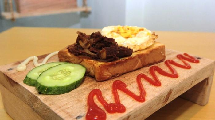 Camilan berupa olahan roti panggang yang dilengkapi topping beef teriyaki dan telur mata sapi ini sungguh menggoda selera.