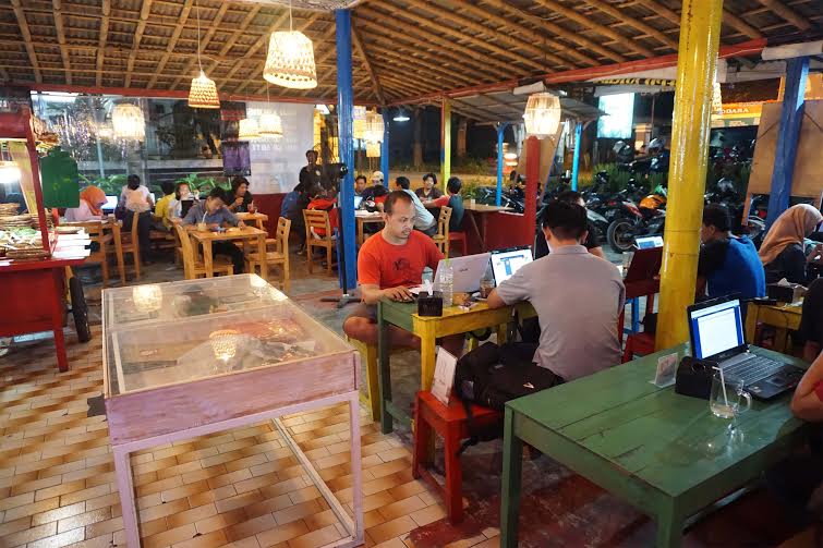 Angkringan Jogja tak selalu kelas kaki lima. Angkringan Mojok ini berkesan 'wah', tempat kumpulnya komunitas, banyak yang bawa laptop!