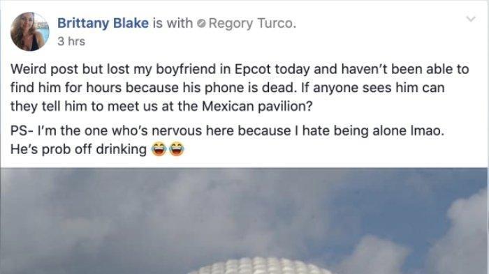 "Pos aneh tapi kehilangan pacar saya di Epcot hari ini dan belum dapat menemukannya berjam-jam karena teleponnya mati . Jika ada yang melihatnya, bisakah mereka memberitahunya untuk menemui kami di paviliun Meksiko? ” tulis Brittany Blake melalui akun Facebooknya