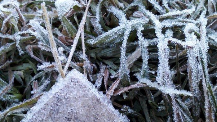 TRIBUNNEWS.COM - Fenomena embun yang berubah menjadi kristal es (frost) kembali muncul di Alun-Alun Surya Kencana, Gunung Gede, Jawa Barat Minggu (6/10/2019) pagi.