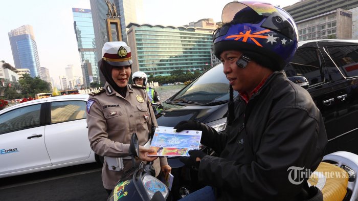 Tribunnews.com, Jakarta - Sejumlah polwan membagi-bagikan Peta Resmi Jalur Lebaran 2015 di Bundaran Hotel Indonesia (HI), Jakarta Pusat, Jumat (26/6/2015).