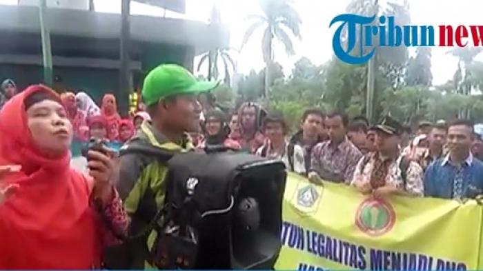 TRIBUNNEWS.COM, CIBINONG - Ratusan guru honorer melakukan aksi unjuk rasa di depan gerbang kantor Bupati Bogor, Jalan Raya Tegar Beriman, Kecamatan Cibinong, Kabupaten Bogor, Jawa Barat, Rabu (10/2/2016).